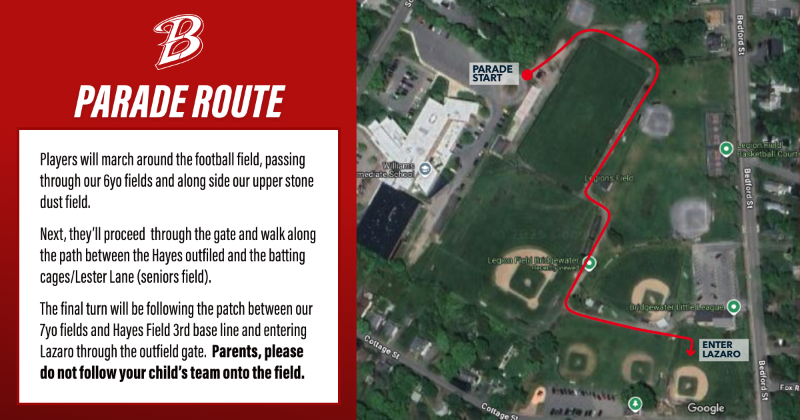 4:15pm –The parade will begin. Players will march around the football field, passing through our 6yo fields and along side our upper stone dust field. Players will come through the gate and walk along the path between the Hayes outfield and the batting cages/Lester Lane (seniors field). The final turn will be following the patch between our 7yo fields and Hayes Field 3rd base line and entering Lazaro through the outfield gate. Parents, please do not follow your child’s team onto the field.